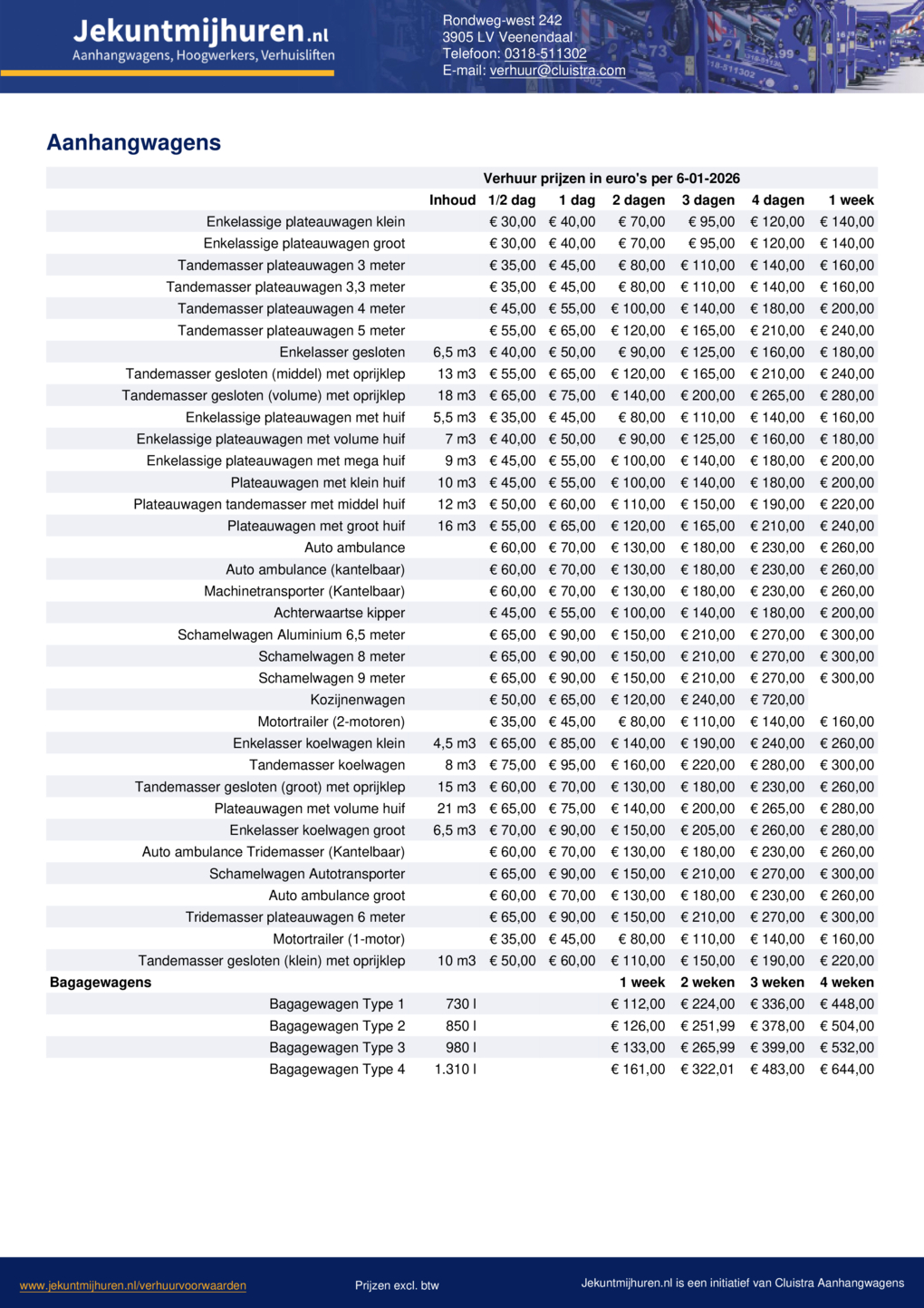 Soms heb je een autotransporter slechts voor een korte periode nodig, dan is het mooi dat je onze aanhangwagens per dagdeel kunt huren. Het kan natuurlijk ook juist andersom zijn, je hebt een aanhangwagen voor een lange periode nodig. In dat geval bieden we je graag een scherpe prijs op basis van de verhuurperiode.