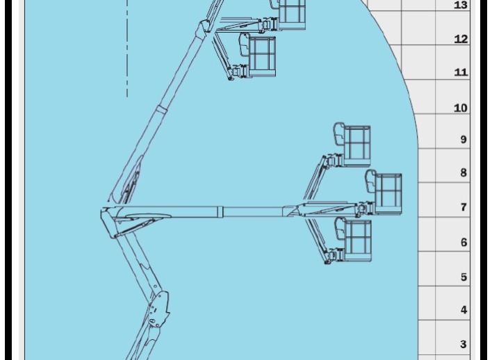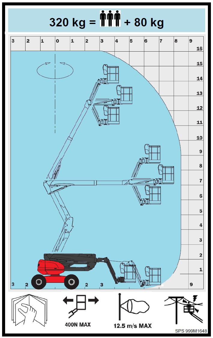 De machine beschikt over een hefvermogen van 320 kg en heeft een werkbak van 4 bij 0,8 meter. Dit betekent dat je met (meerdere) collega’s, gereedschappen en een groot/zwaar product op hoogte kan werken. Dit werkt wel zo efficiënt omdat er minder machinebewegingen nodig zijn.