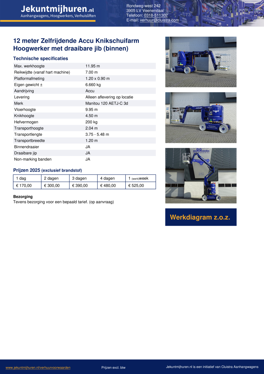 De prijs van het transport van de hoogwerker is afhankelijk van jouw regio. Exact weten? Bel ons even, dan geven we je direct advies over de juiste hoogwerker!