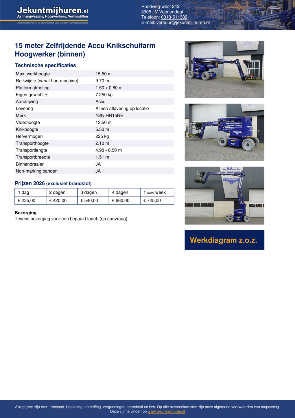 Deze Nifty heeft een werkhoogte van 15,50 meter, een zijdelings bereik van 9,70 meter en een hefcapaciteit van 225 kg. Hiermee is geen klus te zwaar.