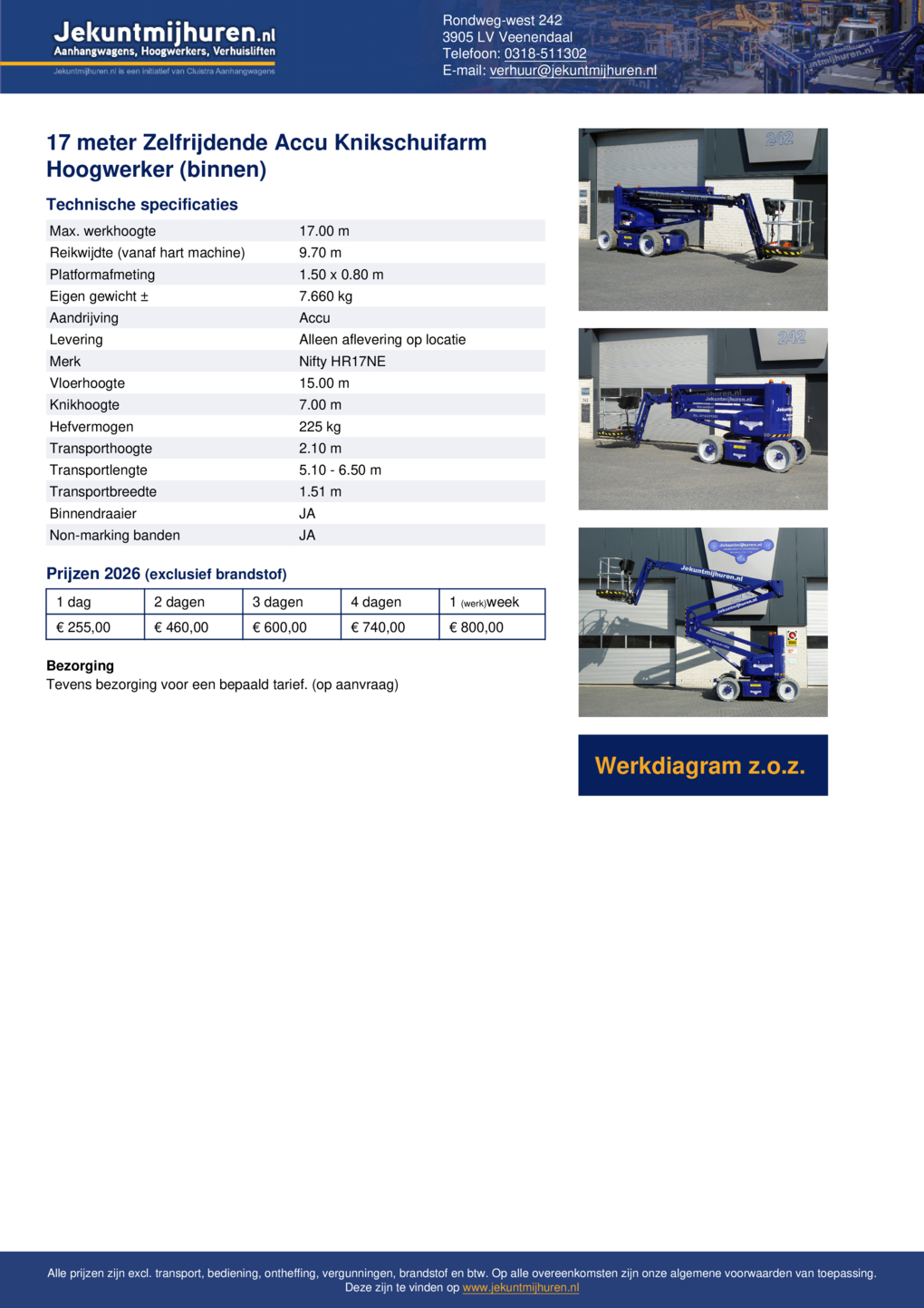 Deze hoogwerker met een werkhoogte van 17 meter heeft een capaciteit van 225 kg. Ruim voldoende om met twee personen op hoogte te werken. Door de compacte opbouw en afmetingen is deze Nifty machine ideaal voor inpandig gebruik zoals in fabrieken, kerken en zelfs kantoren. Het hogere knikpunt van de langere onderarm zorgt ervoor dat er minder ruimte om de machine moet zijn voor het roteren van de mast.