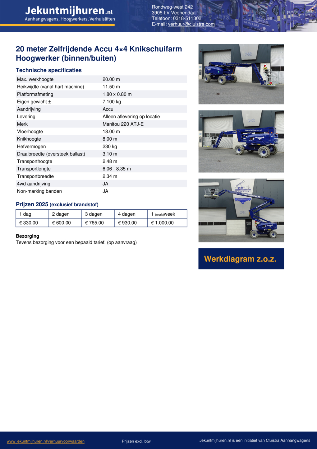 De prijs van het transport van de hoogwerker is afhankelijk van jouw regio. Exact weten? Bel ons even, dan geven we je direct advies over de juiste hoogwerker!