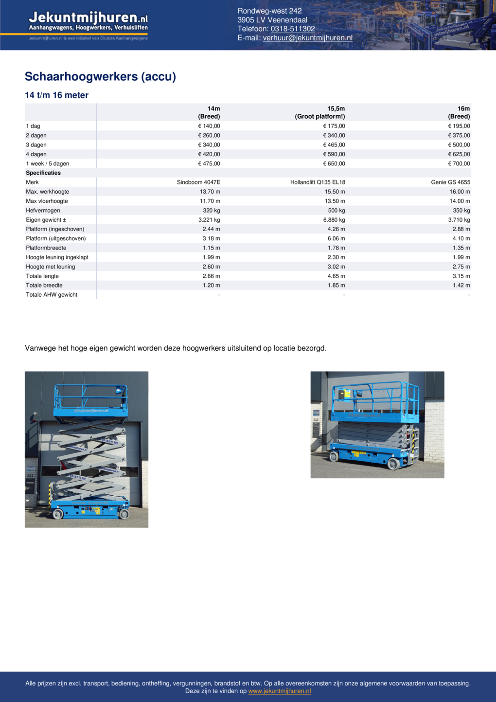 Soms heb je een hoogwerker slechts voor een korte periode nodig, dan is het mooi dat je onze schaarhoogwerkers per dag kunt huren. Het kan natuurlijk ook juist andersom zijn, je hebt een hoogwerker voor een lange periode nodig. In dat geval bieden we je graag een scherpe prijs op basis van de verhuurperiode.