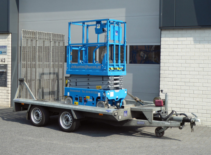 Voor het transport van deze schaarhoogwerker hebben wij een speciale aanhangwagen. Je kunt deze huren voor € 25,00 per dag of voor € 75,00 per week. Voor langere periodes bieden we je in overleg een speciale prijs. Voor het gebruik van deze aanhangwagen heb je een rijbewijs BE nodig.