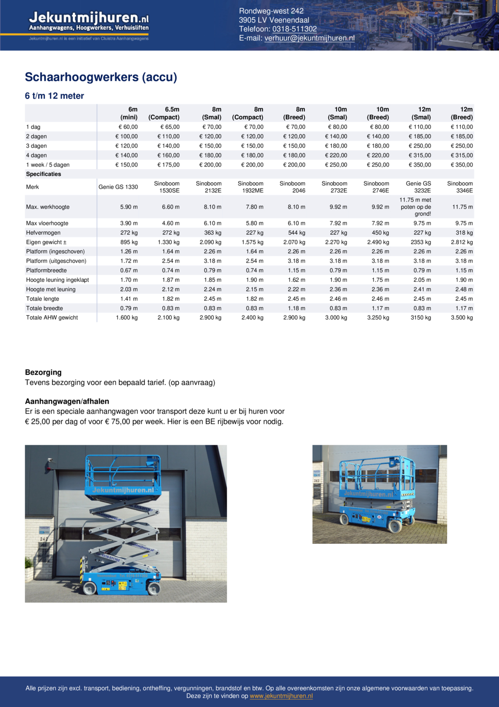 Wil je de hoogwerker op locatie laten bezorgen? Geef dit aan bij je reservering. De prijs van het transport is afhankelijk van jouw regio. Exact weten? Bel ons even, dan geven we je direct advies over de juiste hoogwerker!