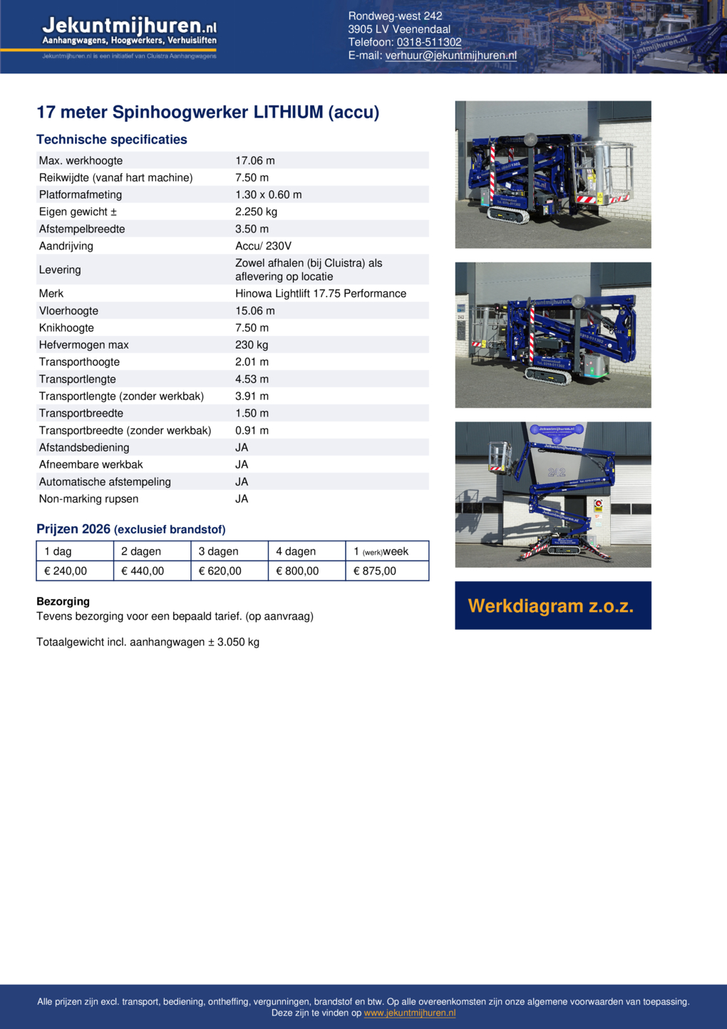 De belangrijkste eigenschappen van de 17 meter Spinhoogwerker LITHIUM (accu) zijn: