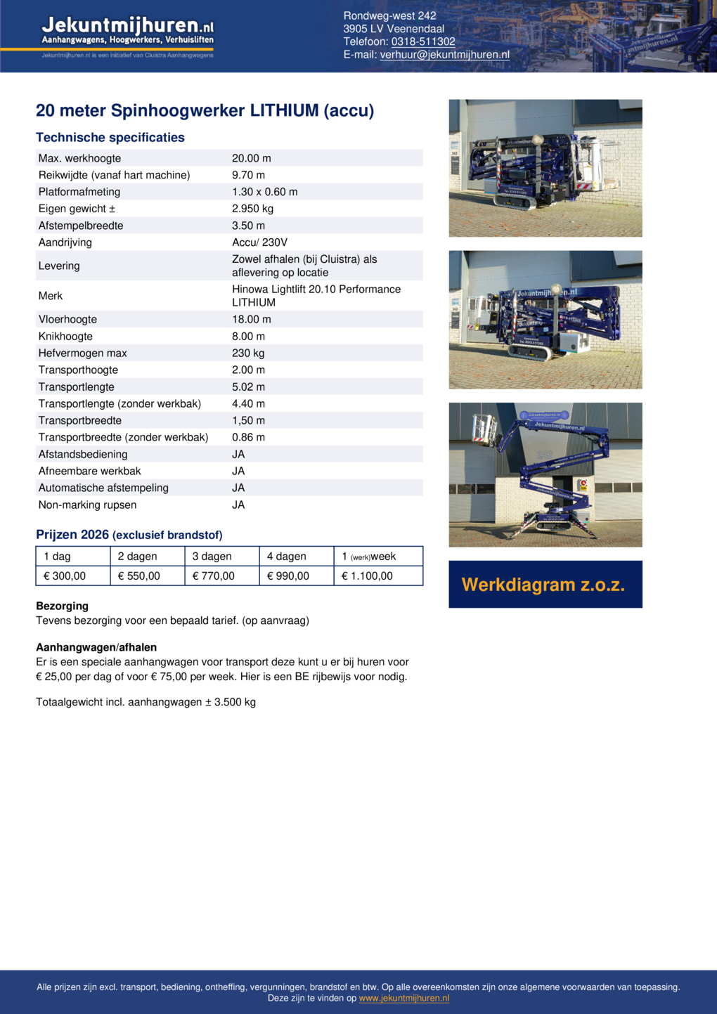 Voor het transport van deze spinhoogwerker hebben wij een speciale aanhangwagen. Je kunt deze huren voor € 25,00 per dag of voor € 75,00 per week. Voor langere periodes bieden we je in overleg een speciale prijs. Voor het gebruik van deze aanhangwagen heb je een rijbewijs BE nodig.