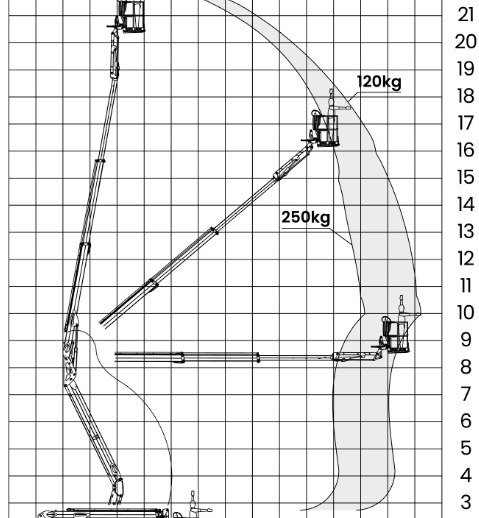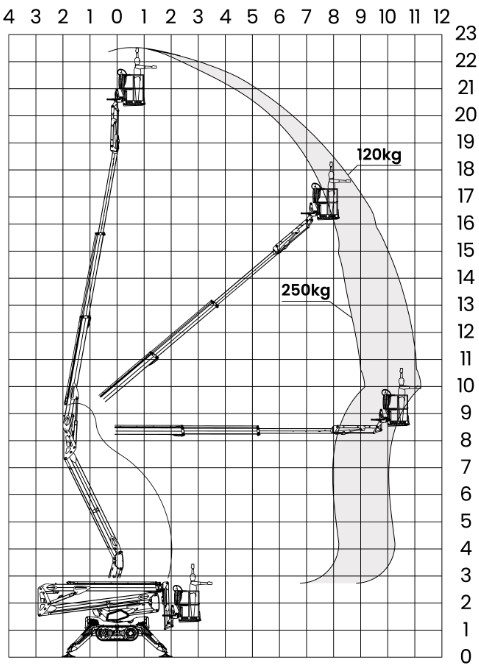 De compacte spinhoogwerker heeft een werkhoogte van 22,5 meter en een zijdelingsbereik van 11,2 meter. En een hefcapaciteit van 250 kg. Een groot bereik voor een machine van slechts 6,08 x 1,35 x 2,2 meter (lxbxh) in transportstand. Met functies als automatische afstempeling en ‘Go-Home’ functie is het ook nog eens efficiënt werken.