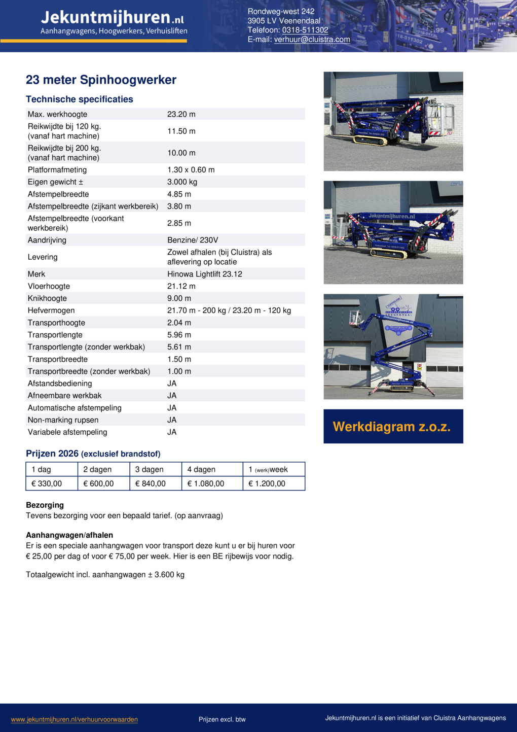 Voor het transport van deze spinhoogwerker hebben wij een speciale aanhangwagen. Je kunt deze huren voor € 25,00 per dag of voor € 75,00 per week. Voor langere periodes bieden we je in overleg een speciale prijs. Voor het gebruik van deze aanhangwagen heb je een rijbewijs BE nodig.