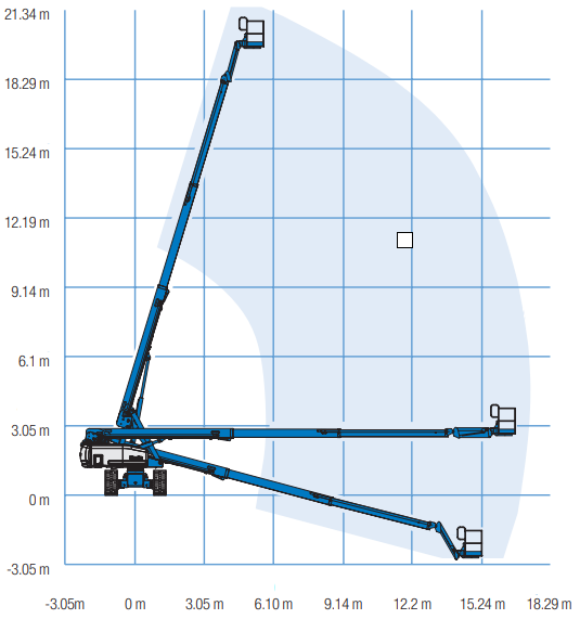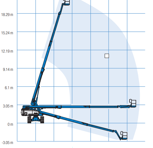 De Genie TRAX S65 is niet alleen robuust. Want hoewel de machine ruim 12 ton weegt, zorgen de rupsen voor een lage bodemdruk. Daarnaast is werkbak zwenkbaar gemaakt zodat er nauwkeurig kan worden gewerkt. Het hefvermogen is voldoende voor twee personen en benodigd gereedschap.